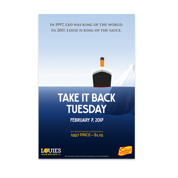 Our creative approach was to focus on what was hot in the world of art, music and entertainment during these particular decades and tie it into the Louie’s brand. Designed as illustrative movie posters, this campaign showed the strength and longevity of Louie’s brand.
